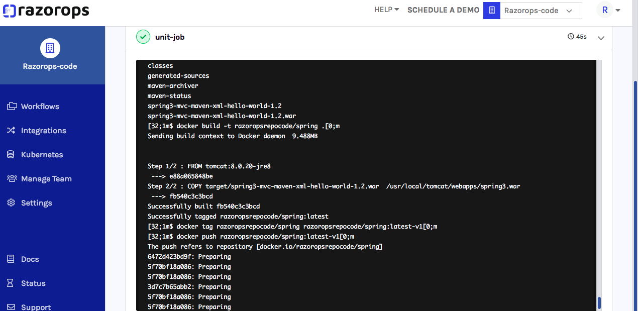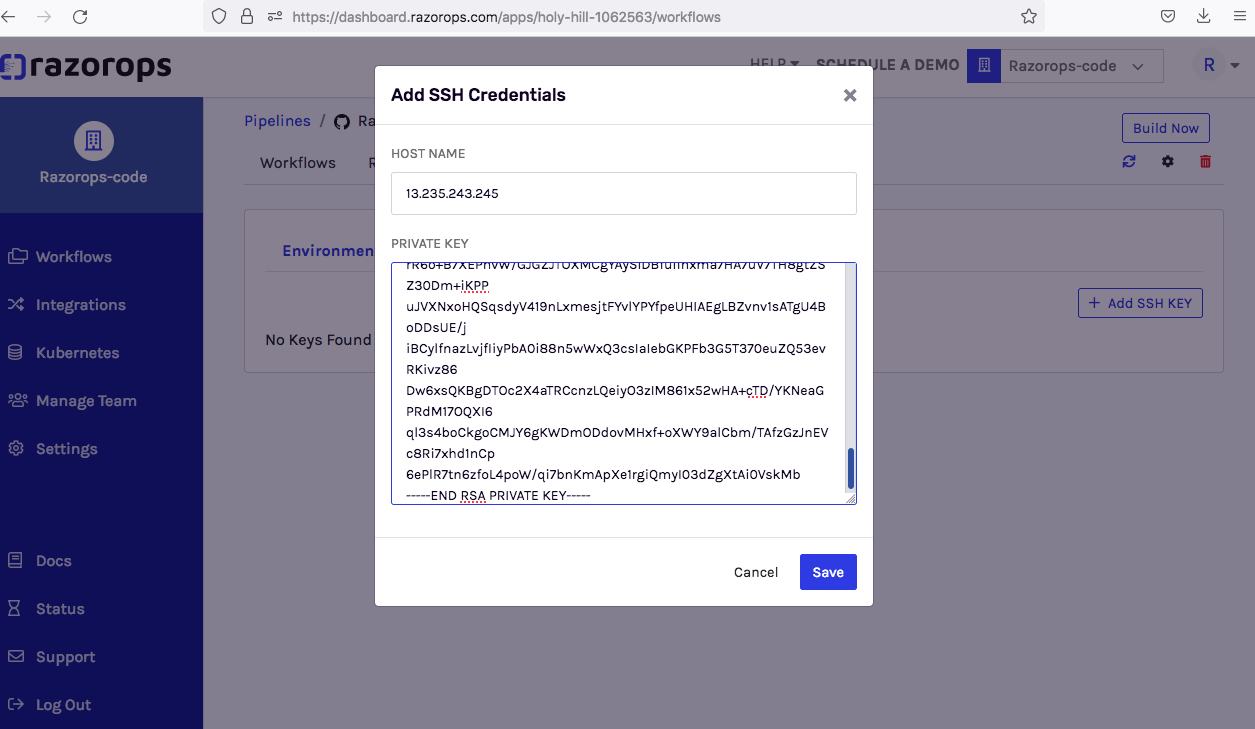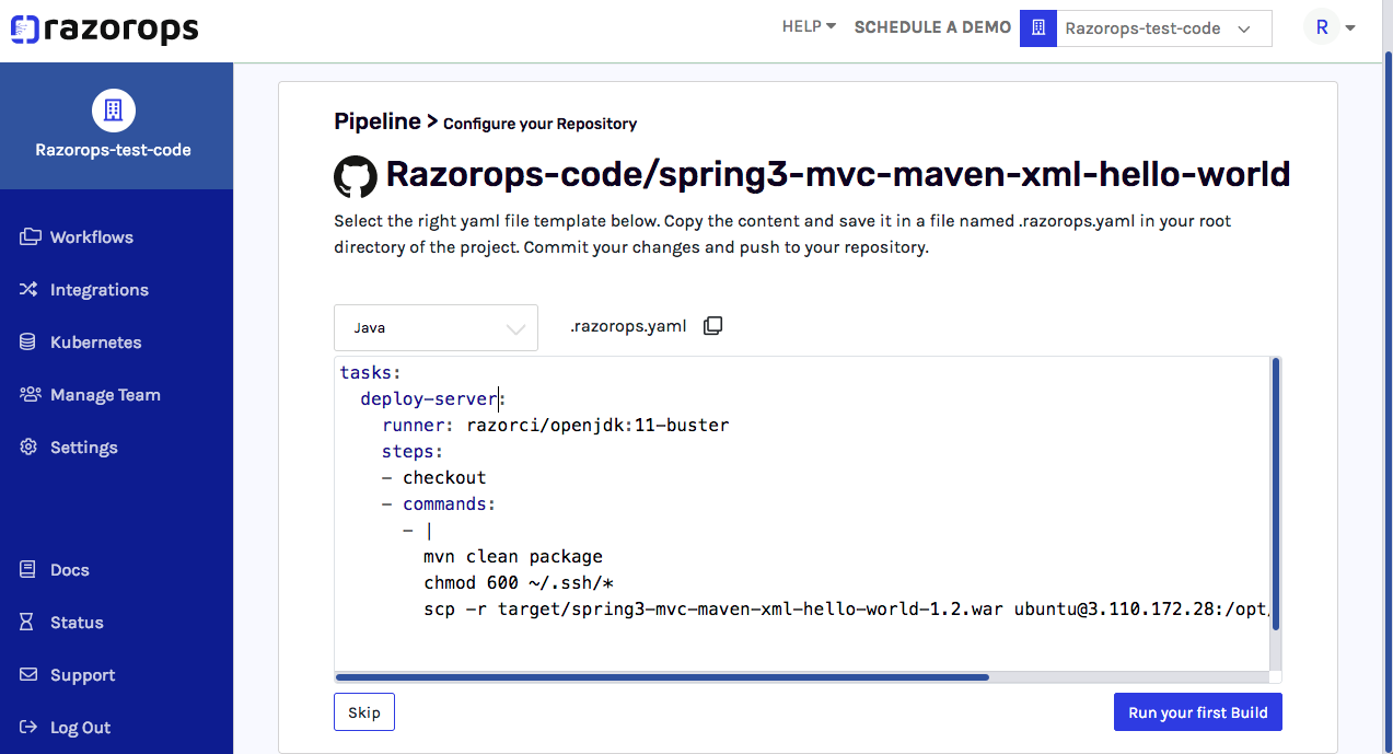 Next you move to workflow process and enter your .razorops.yaml pipeline script