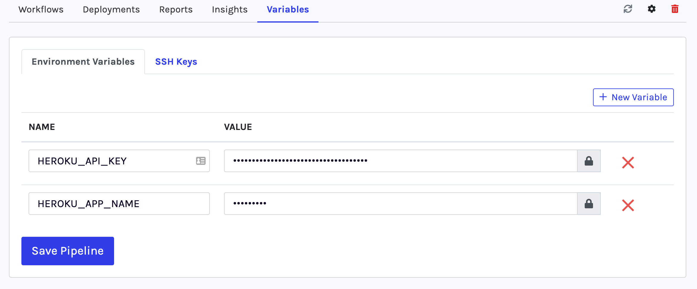 7) Edit your pipeline and add your heroku HEROKU_API_KEY and HEROKU_APP_NAME environment variables
