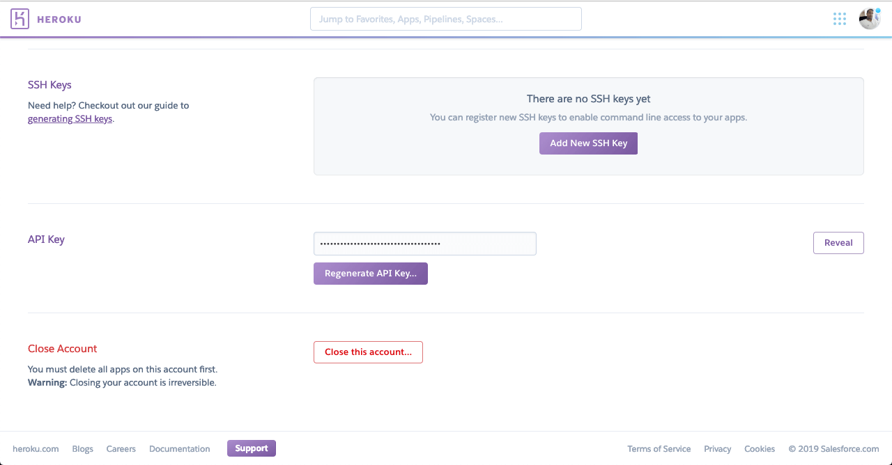 3) Get your Heroku Token or (API Key form your account) https://dashboard.heroku.com/account